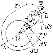 Из (1.3.2) и (1.3.4) следует, что поток поля точечного заряда через любую поверхность, окружающую заряд, равен потоку через сферу произвольного радиуса, концентричную заряду. Действительно, поток поля точечного заряда через любую площадку dS, вырезанную телесным углом d из произвольной поверхности, получается таким же, как поток через площадку