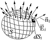 Поток Fэ электрической напряженности Е через замкнутую поверхность S (рис. 1.3.3) определяется как сумма элементарных потоков через все площадки поверхности. В пределе, когда количество площадок N стремится к бесконечности, сумма потоков через площадки переходит в поверхностный интеграл от нормальной компоненты напряженности En: