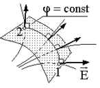 Рассмотрим в пространстве, где имеется электростатическое поле, мысленную поверхность, перпендикулярную силовым линиям. При вычислении интеграла (1.6.7) по любой траектории 1–2, лежащей на этой поверхности, касательная E компонента Е равна нулю. Следовательно, для любых двух точек 1 и 2 этой поверхности правая часть (1.6.7) равна нулю, потенциалы (r1) и (r2) одинаковы. Поверхность, во всех точках которой потенциал имеет одинаковую величину, называется эквипотенциальной. Таким образом, поверхность перпендикулярная к силовым линиям является эквипотенциальной.