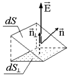 Поток dFэ через площадку, наклонную к силовой линии (т.е. к вектору Е), равен также потоку через проекцию этой площадки на плоскость, перпендикулярную силовой линии (см. рис. 1.3.2):