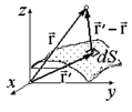На рис.1.2.2 показан случай заряженной поверхности. Ниже приведены формулы расчета декартовых компонент напряженности по известной поверхностной плотности заряда (r):
