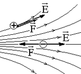 Силовые линии электростатического поля не бывают замкнутыми, не пересекаются вне зарядов, начинаются на положительных зарядах и заканчиваются на отрицательных или уходят в бесконечность. На рис. (1.2.3) в соответствии с картиной силовых линий показаны векторы напряженности и силы, действующей на заряды разного знака.