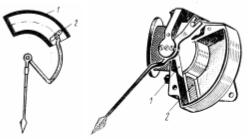 Воздушный успокоитель представляет собой дугообразный цилиндр1, запаянный с одного конца. Внутри цилиндра находится поршень 2. Он жестко связан с подвижной частью прибора и не касается стенок цилиндра. Зазор между поршнем и цилиндром невелик и при быстрых перемещениях поршня давление внутри цилиндра не успевает выровняться с атмосферным. В цилиндре создаются то сгущения, то разрежения воздуха, которые препятствуют движению поршня и тем самым быстро успокаивают подвижную систему. При медленном же движении поршня часть воздуха может свободно входить в цилиндр и выходить из него через зазор, не препятствуя поворотам подвижной части прибора.