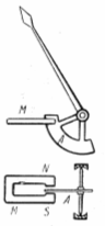 Магнитоиндукционный успокоитель представляет собой перемещающуюся между полюсами постоянного магнита М легкую алюминиевую пластину А, жестко связанную с подвижной системой прибора. При колебаниях пластинки в магнитном поле постоянного магнита в соответствии с законом Ленца в ней индуцируются токи, препятствующие этим колебаниям, поэтому колебания подвижной системы и стрелки быстро прекращаются. Астатические измерительные приборы применяют для устранения влияния внешних магнитных полей на показания электромагнитных и электродинамических приборов. Астатический прибор — это совокупность двух измерительных механизмов, подвижные системы которых объединены в одном приборе и воздействуют на одну и ту же ось со стрелкой. При этом измерительные механизмы расположены так, что под действием внешнего поля вращающий момент одного из них увеличивается, тогда как другого на столько же уменьшается, а общий вращающий момент, действующий на всю подвижную систему прибора, остается неизменным.