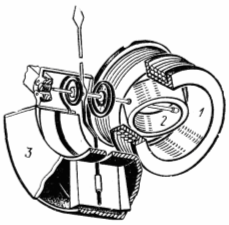 Принцип действия приборов электродинамической системы основан на механическом взаимодействии двух катушек с токами. На рисунке изображен измерительный механизм электродинамического прибора с воздушным успокоителем 3. Неподвижная катушка 1 состоит из двух секций (для создания однородного поля) и навивается обычно толстой проволокой. Легкая подвижная катушка 2 помещается внутри неподвижной и жестко скрепляется с осью и стрелкой. Подвижная катушка включается в измеряемую цепь через спиральные пружины, создающие противодействующий момент.Если токи в катушках 1 и 2 принять равными соответственно