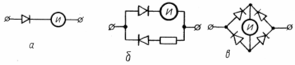 Детекторные приборы — это совокупность выпрямителя, называемого детектором, и магнитоэлектрического измерителя. Такое сочетание вызвано необходимостью измерений малых токов и напряжений переменного тока. Приборами наиболее высокой чувствительности и точности являются магнитоэлектрические приборы, но они непригодны для переменных токов, поэтому измеряемые переменные ток или напряжение выпрямляются с помощью специального выпрямителя, а затем измеряются магнитоэлектрическим прибором. Возможные схемы измерителей совместно с детекторами приведены на следующих рисунках: