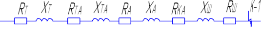 Тогда периодическая составляющая тока к.з. остаётся неизменной в течении всего времени действия к.з.,тогда считаем, что IП 0=IКЗ. На расчётной схеме отмечаем расчётные точки к.з. и для каждой точки составляем схему замещения, на которой указываем активные и индуктивные составляющие, сопротивления всех элементов схемы от точки питания до точки к.з.