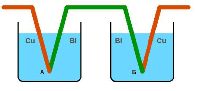Эффект Пельтье был открыт французом Жаном-Шарлем Пельтье в 1834 году. При проведении одного из экспериментов он пропускал электрический ток через полоску висмута, с подключенными к ней медными проводниками (рис. 1.1.). В ходе эксперимента он обнаружил, что одно соединение висмут-медь нагревается, другое – остывает.