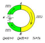 На рис. 1.3. изменение знака источника меняет направление тока на противоположное: от ПП2 к ПП1 на контакте А и от ПП1 к ПП2 на контакте В. Соответственно меняется знак тепла Пельтье и соотношение между температурами контактов: Qп (А)<0, ТА<ТВ.