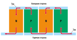 Тепло Пельтье пропорционально силе тока и может быть выражено формулой: