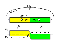 Эффект Пельтье, как и все термоэлектрические явления, выражен особенно сильно в цепях, составленных из электронных (n - тип) и дырочных (р - тип) полупроводников. В этом случае эффект Пельтье имеет другое объяснение. Рассмотрим ситуацию, когда ток в контакте идет от дырочного полупроводника к электронному (р®n). При этом электроны и дырки движутся навстречу друг другу и, встретившись, рекомбинируют. В результате рекомбинации освобождается энергия, которая выделяется в виде тепла. Эта ситуация рассмотрена на рис. 1.4., где изображены энергетические зоны (ec- зона проводимости,ev- валентная зона) для примесных полупроводников с дырочной и электронной проводимостью.