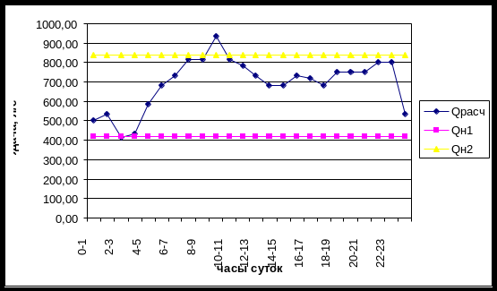 | Часы суток | Qрасч | Qн1 | Qн2 | К | ||||