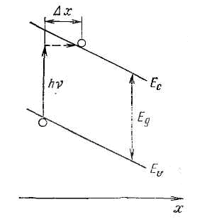 Край спектра поглощения полупроводника λгр может смещаться в длинноволновую сторону при приложении электрического поля; это явление известно как эффект Келдыша - Франца. Действие электрического поля приводит к наклону энергетических зон в пространстве, так что при энергии квантов hvg электрон может оторваться от атома вследствие туннелирования между состояниями валентной зоны и зоны проводимости, разделенными в кристалле малым расстоянием Δχ (рисунок 1.3). Расчет показывает, что ширина запрещенной зоны уменьшается пропорционально квадрату напряженности электрического поля; этот сдвиг для арсенида галлия около 10-15 эВ∙В-2∙см-2. При реально достижимых электрических полях удается сместить край поглощения на несколько сотых долей электрон-вольта, что по абсолютной величине мало, но может приводить к изменению коэффициента поглощения на три порядка. Эффект Келдыша - Франца используется для создания высокоскоростных модуляторов света.