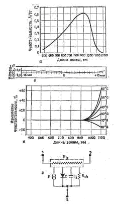 Обратный ток кремниевых р-n переходов существенно меньше, чем германиевых. Поэтому порог чувствительности кремниевых фотодиодов порядка 10-13... 10-14 Вт/Гц1/2, германиевых - порядка 10-12 Вт/Гц1/2. Кремниевые фотодиоды работают в более широком интервале температур.