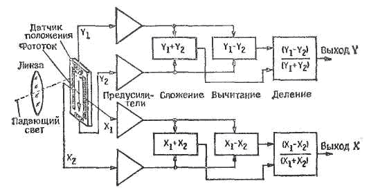 Сигналы Y1 и Y2 с помощью предусилителей согласуются с вычислительной схемой, формирующей отношение разности сигналов к их сумме. Процесс вычисления аналогичен осуществляемому в линейных датчиках положения. Благодаря дополнительной степени свободы (по оси X) осуществляется двухкоординатное измерение положения.