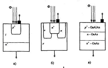 Существуют важные разновидности фотодиодов: p-i-n диоды - а, лавинные - б, гетерофотодиоды - в (рисунок 2.5) и др.