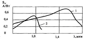 Рисунок 2.3 - Спектральные характеристики германиевого (1) и кремниевого (2) фотодиодов