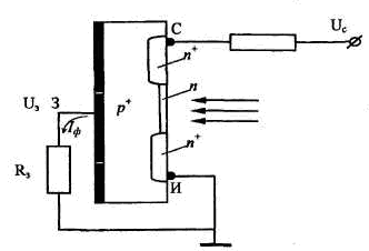 Структура полевого фототранзистора представлена на рисунке 2.8. Такие транзисторы характеризуются высоким входным сопротивлением (до 106 Ом) и имеют хорошие пороговые характеристики, высокое быстродействие (вследствие отсутствия инжекции и диффузионной емкости на входе). Эти фототранзисторы имеют лучшую температурную стабильность и повышенную радиационную стойкость по сравнению с биполярными фото-транзисторами.