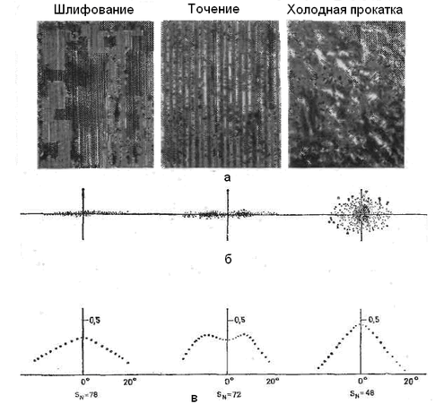 На рисунке 2.14 изображены поверхности различного качества, характерные для деталей, изготовленных точением, шлифованием и прокаткой. При точении и шлифовании получается равномерный бороздчатый профиль, тогда как прокатанная поверхность имеет нерегулярный рельеф. Это различие отчетливо проявляется в характере светорассеяния, так как в противоположность точеной и шлифованной поверхности прокатанная поверхность имеет центросимметричное распределение интенсивности рассеянного света.