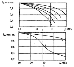 Рисунок 2.4 - Частотные характеристики фотодиода на основе кремния р-типа (а) n-типа (б) при напряжении 1 - 0 В; 2 - 1 В; 3 - 4 В; 4 - 10 В; 5 - 100 В; 6 - 15 В; 7 - 150 В