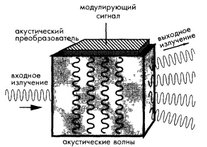 На поверхность кристалла прикреплены два электрода, при изменении напряжения на которых происходит изменение поляризации падающего света на втором поляризаторе, что, в свою очередь, ведет к модуляции интенсивности выходного излучения Подобный эффект можно наблюдать, когда кристалл подвергается воздействию механических сил, особенно, акустических волн. Однако акустико-оптические устройства используются в оптоволоконной технике, в основном, в качестве оптических фазовращателей и сравнительно редко как модуляторы интенсивности излучений. Акустические волны, проходя через кристалл, вследствие эффекта фотоупругости вызывают в нем механические напряжения, линейно изменяющие его коэффициент преломления. Это, в свою очередь, при определенных условиях приводит к отклонению выходящих оптических лучей, также проходящих через этот кристалл (Рисунок 2.10) Таким образом, акустические волны создают для лучей света как бы дифракционную решетку. Акустикооптические устройства часто изготавливаются из ниобата лития и кварца, которые способны работать с акустическими волнами в широком частотном диапазоне: от десятков МГц до нескольких ГГц. Скорость звука через ниобат лития составляет порядка 6х103м/с, поэтому 1-ГГц акустическая волна, имеющая длину волны 6 мкм, сравнима с излучением в И К спектральном диапазоне.