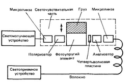На рисунке 2.11 приведена структурная схема датчика ускорения, работающего по тому же принципу, что и датчик давления. Здесь также груз прикреплен непосредственно к фотоупругому элементу. При колебаниях на фотоупругий элемент действует сила, пропорциональная произведению массы груза на ускорение,