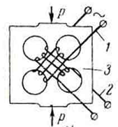 Изменение измерено с помощью известных электрических схем (рисунок 2.2). Получающиеся при этом большие измерительные сигналы исключают необходимость применения измерительных усилителей. Другая возможность использования магнитоупругого эффекта показана на рисунке 2.3. В пластинах из листовой стали имеются четыре отверстия. В этих отверстиях помещены две пересекающиеся обмотки, одна из которых включена в цепь питания, другая — в цепь измерения. При нагружении этого чувствительного измерительного элемента ранее симметричное магнитное поле искажается и в измерительной обмотке возбуждается напряжение, пропорциональное нагружение (рисунок 2.3,б).