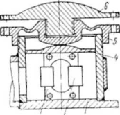 Чувствительный элемент 1 с обмотками 2, залитый компаундом, устанавливается внутри стального корпуса 3. На торцевую поверхность чувствительного элемента ложится стальной сферический сегмент 4, который прижимается крышкой 5, навинчиваемой на корпус. Крышка имеет небольшие кольцевые гофры, которые обеспечивают ее подвижность в небольших пределах. Вследствие этого практически исключается по- явление погрешности при передаче усилия на чувствительный элемент. Верхняя вывинчивающаяся часть 6 крышки предназначена для регулировки высоты МД.