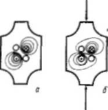 Рисунок 2.3. Картина силовых линий магиит-вого поля в магннтоупругом тензометре; в — без нагрузки; б — под нагрузкой
