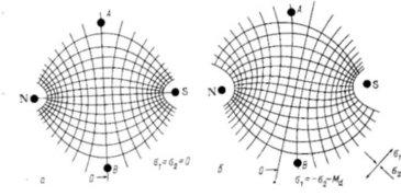 В магнитоупругих преобразователях (датчиках) крутящего момента вокруг неподвижного или вращающегося стального вала расположены три кольцевых полюса магнитных систем, снабженных обмотками. Обмотка среднего полюсного кольца возбуждается переменным током и создает на поверхности вала переменное магнитное поле, которое при ненагруженном вале располагается полностью симметрично между обоими полюсами N и S, как это показано на рисунке 2.7, а. Нулевая эквипотенциальная линия этого поля расположена соосно со вторичными обмотками А и В, которые сдвинуты на половину расстояния между полюсами и соединены между собой встречно. Поэтому разностное напряжение равно нулю. Если теперь подвергнуть вал воздействию крутящего момента то это вызовет изменение магнитной проницаемости, что в свою очередь сопровождается пропорциональным величине и направлению этого момента отклонением нулевой эквипотенциальной линии вправо или влево (рисунок 2.7, б).