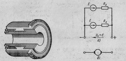 В результате установки щеток и соединения их с внешней цепью обмотка якоря по отношению к его зажимам оказывается разделенной на параллельно соединенные ветви с одинаковыми э. д. с. Е и сопротивлениями Rа. Из схематически изображенной на рис. 6, а обмотки якоря видно, что э. д. с. якоря Е равна э. д. с. любой из параллельно соединенных ветвей. Внутреннее сопротивление якоря Rя — это эквивалентное сопротивление параллельно соединенных ветвей обмотки. Обычно оно мало (от долей ома у крупных машин до единиц ом у небольших). Если к зажимам якоря генератора присоединить внешнюю электрическую цепь, то э. д. с. якоря создаст в цепи ток якоря (ток нагрузки, рабочий ток). В двигателе ток создается внешним источником и в якоре делится на токи параллельных ветвей. Направление тока во всех проводниках одной параллельной ветви одинаковое, противоположное направлению токов в другой ветви.