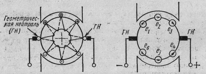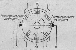 Если установить неподвижные электрографитовые щетки для осуществления скользящего контакту с проводниками, проходящими геометрические нейтрали (см. рис. 3), то между щетками всегда будут находиться проводники обмотки с одинаково направленными э. д. с. е, сумма которых максимальна и постоянна (при сдвиге щеток эта сумма уменьшается).
