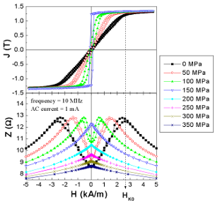 Рис. 1 Петли гистерезиса и полевые зависимости импеданса фольг состава Co77Fe8B15 при различных значениях упругих растягивающих напряжений.
