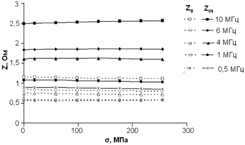 Влияние упругих растягивающих напряжений на эффект магнитного импеданса аморфных фольг состава Fe4Co67Mo1,5Si16,5B11 (Vitrovac 6025Z) исследовались в работе [9]. Образцы были вырезаны перпендикулярно длине исходной ленты. Ось легкого намагничивания в исходной ленте направлена вдоль оси прокатки, поэтому у образцов она будет ориентирована поперек длины. Полученный характер частотных зависимостей ГМИ-эффекта от величины упругих растягивающих напряжений в основном обусловлен поведением максимального импеданса Zm. Это иллюстрируется зависимостями начального Z0 и максимального импеданса Zm от упругих напряжений на различных частотах переменного тока (рис. 3). Как видно, во всем частотном диапазоне упругие напряжения слабо влияют на Z0 и Zm. Однако, следует отметить, что на частотах менее 4 МГц с ростом упругих напряжений наблюдается слабое уменьшение Zm, начальный импеданс Z0 при этом практически не изменяется. На частотах более 4 МГц рост упругих напряжений приводит к увеличению Zm и небольшому уменьшению Z0.