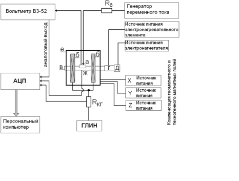 Кольца Гельмгольца были подсоединены к генератору линейно изменяющихся напряжений (ГЛИН), что позволяло создавать изменяющееся во времени магнитное поле. Напряженность магнитного поля, создаваемого кольцами Гельмгольца, определялась по падению напряжения на образцовом резисторе Rкг. Резистор был включен последовательно с кольцами Гельмгольца. Его сопротивление было выбрано таким, чтобы падение напряжения на нем численно соответствовало напряженности магнитного поля в Эрстедах. Резистор был выполнен из манганинового сплава и приведен в тепловой контакт с массивными радиатором для минимизации температурного дрейфа.