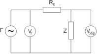 Рис. 12 Принципиальная схема измерения импеданса: Г – генератор ВЧ тока; Vr – вольтметр, измеряющий выходное напряжение генератора; Rб – балластное сопротивление; Z – образец; Vобр – вольтметр, измеряющий напряжение на образце.