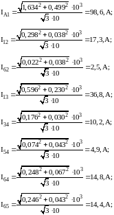 где Р – это значение активной мощности на каждом из участков сети, кВ∙А; Q – значение реактивной мощности протекающей по каждому из участков сети, кВар; Uн – номинальное напряжение сети, кВ.