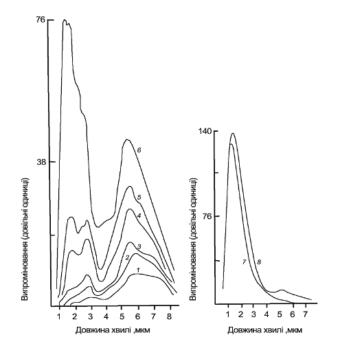 На (рис. 1.1).зображені криві випромінювання для одного і того ж тіла розжарення при різних споживаних потужностях.