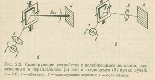 Зеркало размещают либо до объектива в параллельном пучке лучей (рис. 2а), либо за объективом в сходящемся пучке (рис. 2б). В первом случае достигается высокое качество изображения (ввиду отсутствия дополнительных аберраций), но при этом размеры колеблющегося зеркала должны быть большими и требования к качеству изготовления его отражающей поверхности - жёсткими.