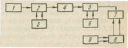Рис. 3.1. Структурная схема тепловизора с электронным сканированием: — оптическая система; 2 — блок передающей Телевизионной трубки; 3 — блок кадровой и строчной разверток передающей трубки; 4 — предварительный усилитель видеосигнала; 5 — видеотракт ;6-генератор гасящих и синхронизирующих импульсов;7- блок приёмной телевизионной трубки;8- блок кадровой и строчной разверток приёмной трубки; ; 9 — блок синхронизации