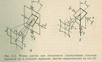 ).Сканирующее плоское зеркало может быть жестко закреплено на оси под углом 45°, так что сканирование вдоль строки обеспечивается поворотами зеркала относительно этой оси на угол ±, а сканирование по кадру — поворотом зеркала вместе с осью, на которой оно закреплено, на угол ± (рис.2.3б) В этом случае форма растра близка к трапеции. При = +10° и =• 95° искривления строк в верхней и нижней частях растра составляет 3% , а искривления угловых размеров каждой строки не превышает 5 % . Наряду с одним плоским зеркалом, имеющим две степени свободы, сканирующих устройствах можно применять два зеркала, каждое из которых совершает колебательное движение относительно взаимно перпендикулярных осей, образуя телевизионный растр.