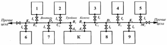 Схема воздухоснабжения промышленного предприятия представлена на рис.1, размеры отдельных участков схемы трубопровода приведены в табл.1. Номера цехов соответствуют указанным выше названиям.