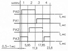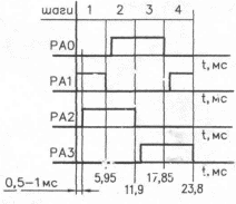 Временные диаграммы импульсов управления электродвигателем (скорость вращения ротора двигателя 168 шаг/с - скорость перемещения штока 7 мм/с).