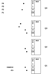 Для управлением направлением движения штока будем использовать сигнал реверса. Для переключения входов, построим схему, используя мультиплексоры типа 2-1.