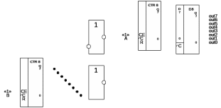 На схеме вход В – вход с генератора требуемой частоты. На вход А поступают сигналы с датчика, стоящего на двигателе. Выходы out7 – out0 – значение текущей скорости двигателя.