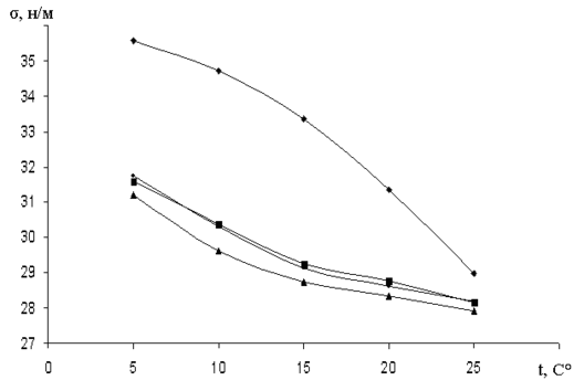 Рис. 5. Кривые зависимости поверхностного натяжения от температуры суспензии графита в масле.