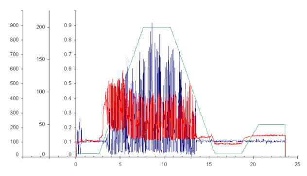 При испытании в режиме изменении частоты (рис. Х) при выходе на частоту более 235 Гц происходит снижение амплитуды, где при 500 Гц частота становиться равной 0, что свидетельствует об образования схватывания и неспособности масла И-20А выдержать такие частоты. Поэтому было принято решение снизить верхний предел частоты до 227 Гц с учетом постоянного градиента изменения.