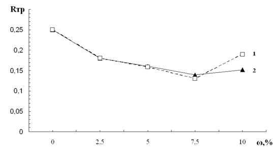 Исходя из графиков видно, что выполняется зависимость понижения поверхностного натяжения с увеличением температуры, как для графита, так и для дисульфида молибдена. Выполняется зависимость понижения поверхностного натяжения с увеличением концентрации добавки для графита, однако для дисульфида молибдена это закон не выполняется. Это можно объяснить повышением плотности суспензии с увеличением концентрации добавки, это наблюдается у обоих материалов, однако у дисульфида молибдена это более выражено.