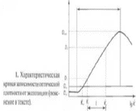 Основні сенситометричні характеристики фотоматеріалів визначають по експериментальній характеристичній кривій (сенситограмі, Рис.1.1), що виражає залежність між логарифмом експозиції Н і оптичною щільністю почорніння D, утвореного металевим сріблом. Експозицію обчислюють за формулою: Н= Et, де E - освітленість, t – час експонування (витримка). Оптична щільність ділянок фотографічного шару, що не піддавалися дії світла, називається оптичною щільністю фотографічної вуалі Dо. Вона не залежить від експозиції і визначається властивостями самого фотоматеріалу і умовами його обробки. Прийнята у фотографії величина мінімальної оптичної щільності є сумою значень оптичної щільності вуалі і оптичної щільності підкладки. Найбільша оптична щільність почорніння (потемніння) фотоматеріалів, тобто щільність у вищій точці характеристичної кривої, називають максимальною щільністю D.