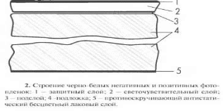 Рис1.2.1. Будова чорно-білих негативних і позитивних фотоплівок:1.захиний шар;2-світлочутливий шар; 3-підшар; 4-підкладка; 5-протискручующий антистатичний безкольоровий лаковий шар.